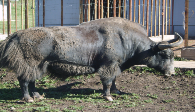 肃南牦牛:体型外貌上带有野牦牛的特征。体质结实,体驱结构良好体态结构紧凑,前躯发达,后躯较差。头大,额宽;角粗、皮松厚;耆甲高长宽,前肢短而端正,后肢呈刀状;体侧下部密生粗长毛,犹如穿统裙,尾短并生蓬松长毛。公牦牛头粗重,呈长方形;颈短厚且深,睾丸较小,接近腹部、不下垂;母牦牛头长,眼大而圆,额宽、个别有角、颈长而薄,乳房小、呈碗碟状,乳头短小,乳静脉不明显。毛色多为黑褐色,占71.8%,嘴唇、眼眶周围和背线处的短毛为灰白色或污白色。