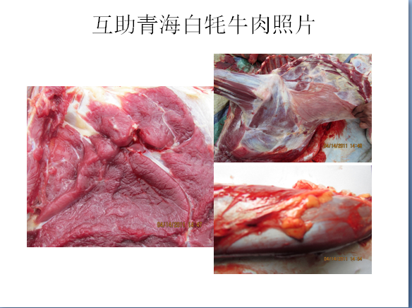 1. 感官特征:互助青海白牦牛总观外貌:体质坚实,结构紧凑而匀称;侧视整个体躯低深而长,偏向肉用体态。前躯发育良好、中躯次之、后躯欠佳。体上线鬐甲高长、背腰平直和十字部上隆而形成浅波浪式;体下部周围和体上线密生粗长毛夹生少量绒毛、两型毛,体侧中部和颈部密生绒毛和少量两型毛;椎体短,着生蓬松似人发粗细的长毛。全身被毛白色,裸露面多有大小不等的色素斑和被毛中有隐斑。互助青海白牦牛肉:颜色深红,野味十足,有嚼劲;白牦牛肉生食软滑,通气开窍;白牦牛精选肉质略瘦,瘦而不柴,红白相间,美味可口。2. 独特内含成分